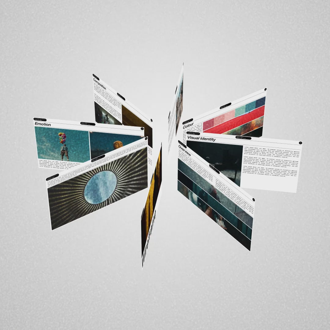 Clean grids, dramatic blacks and confident typographic hierarchy give your images and written ideas room to breathe while maintaining a premium, cinematic tone that feels serious and intentional.